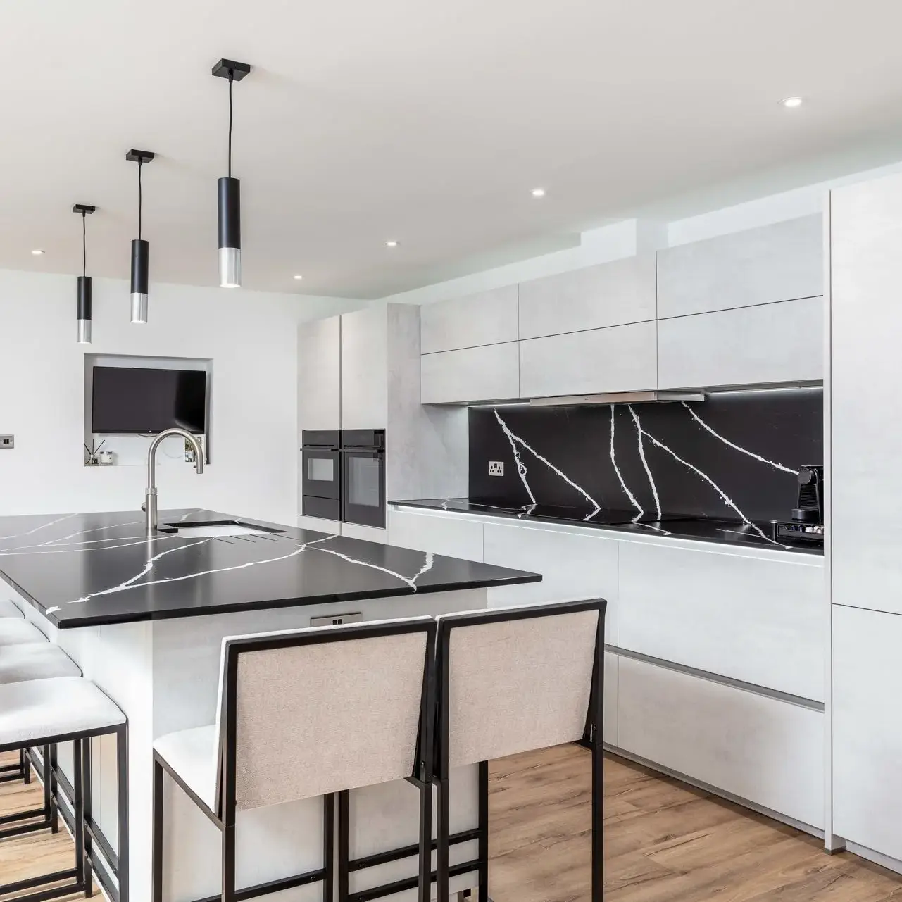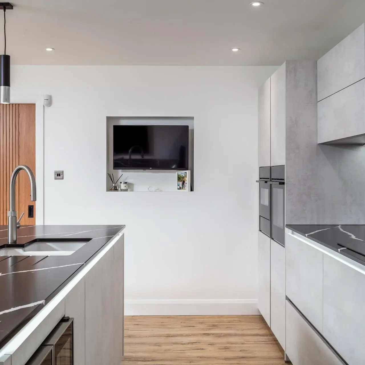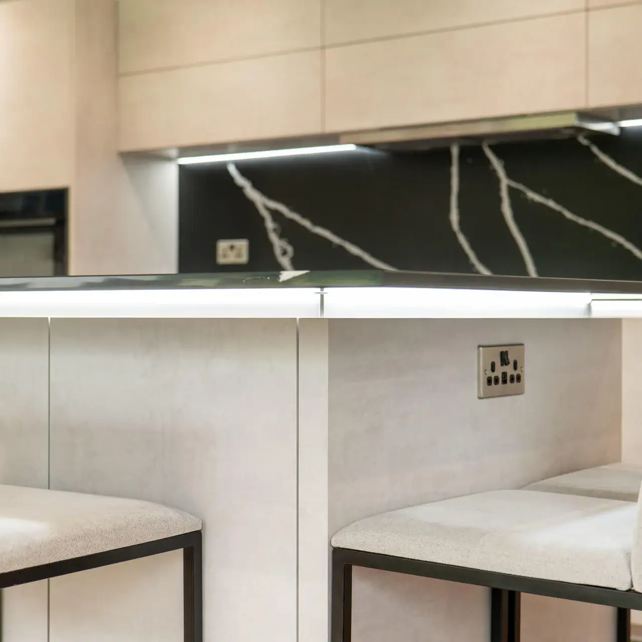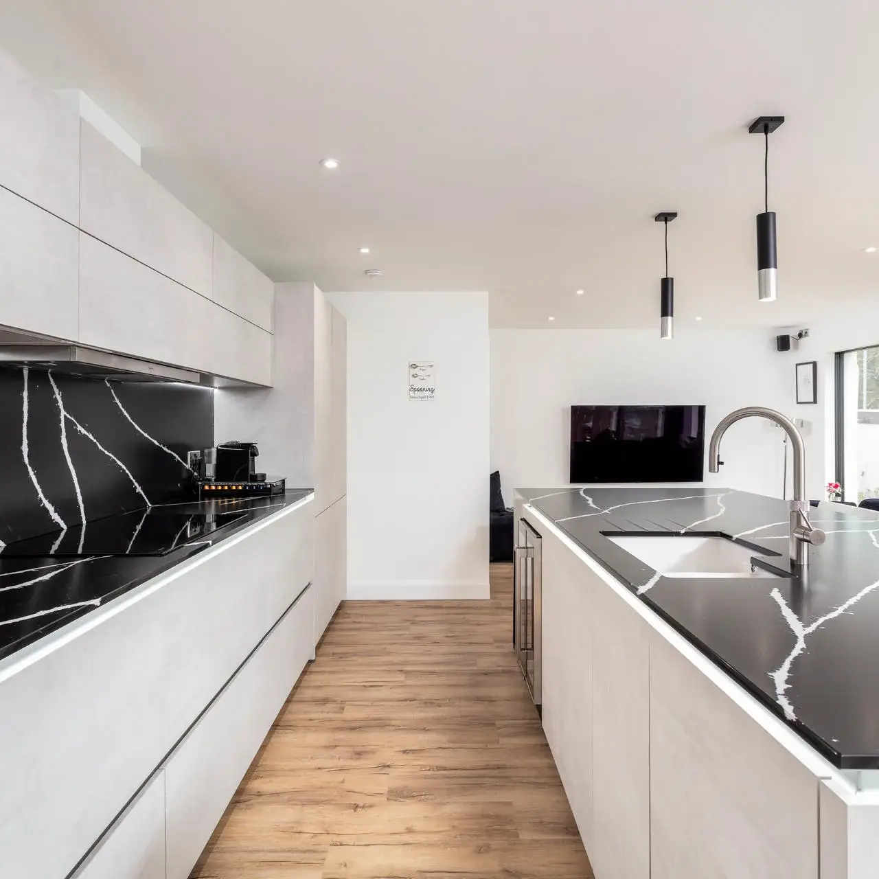 To bring this vision to life, Creative Designs supplied and installed a Nolte handleless kitchen with recessed lighting, creating a seamless and refined aesthetic. The design featured Silestone worktops, splashbacks, and waterfall ends to the island in Eternal Marquina, chosen for their luxurious dark tone and striking visual appeal.