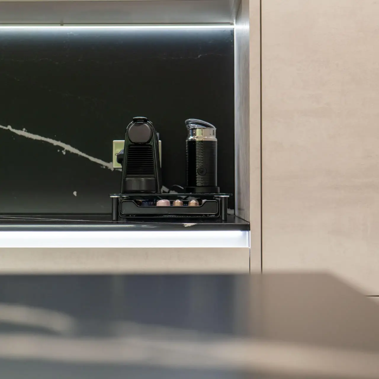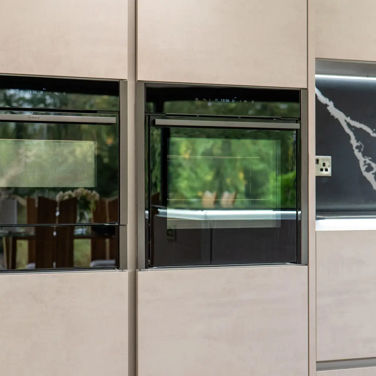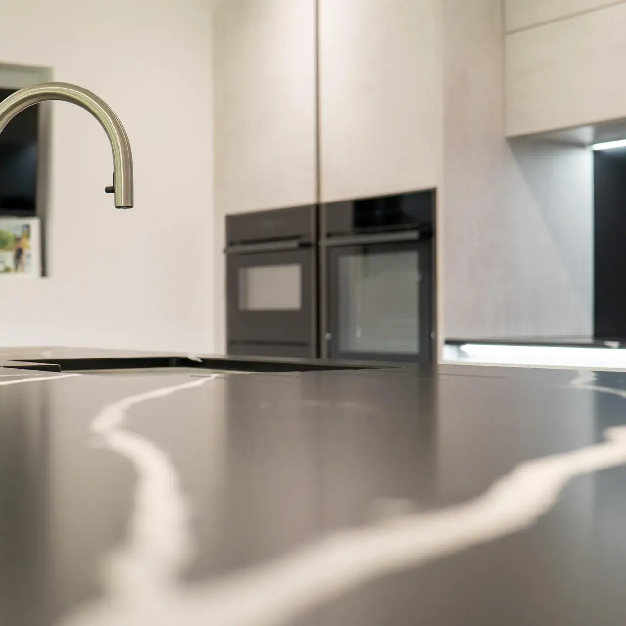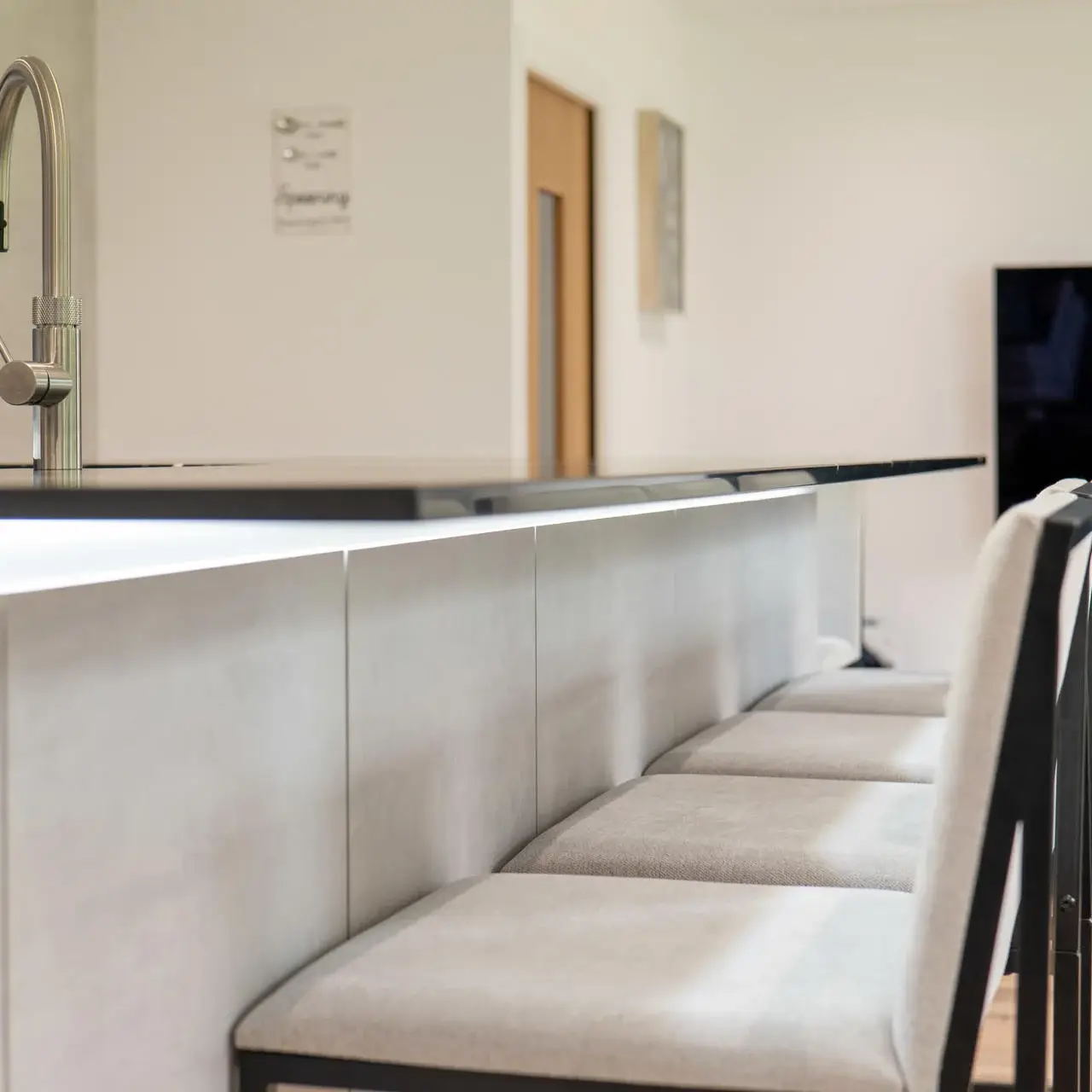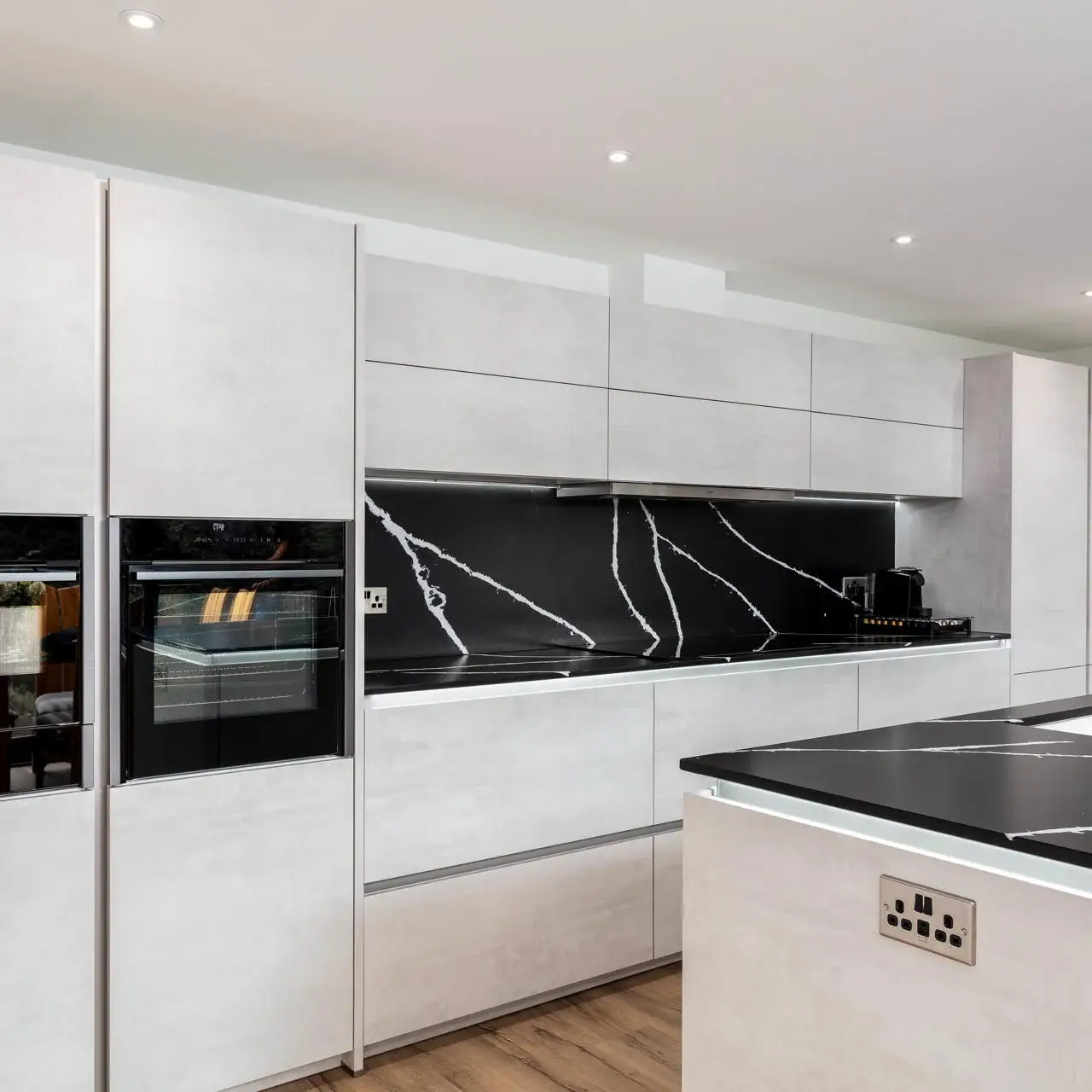 To bring this vision to life, Creative Designs supplied and installed a Nolte handleless kitchen with recessed lighting, creating a seamless and refined aesthetic. The design featured Silestone worktops, splashbacks, and waterfall ends to the island in Eternal Marquina, chosen for their luxurious dark tone and striking visual appeal.