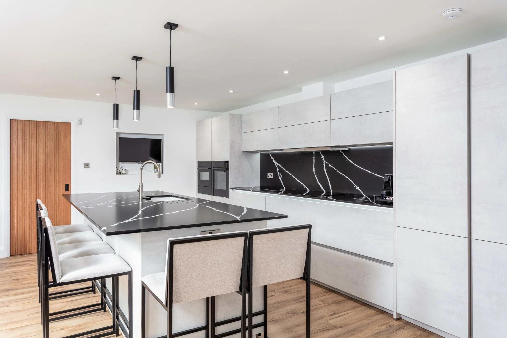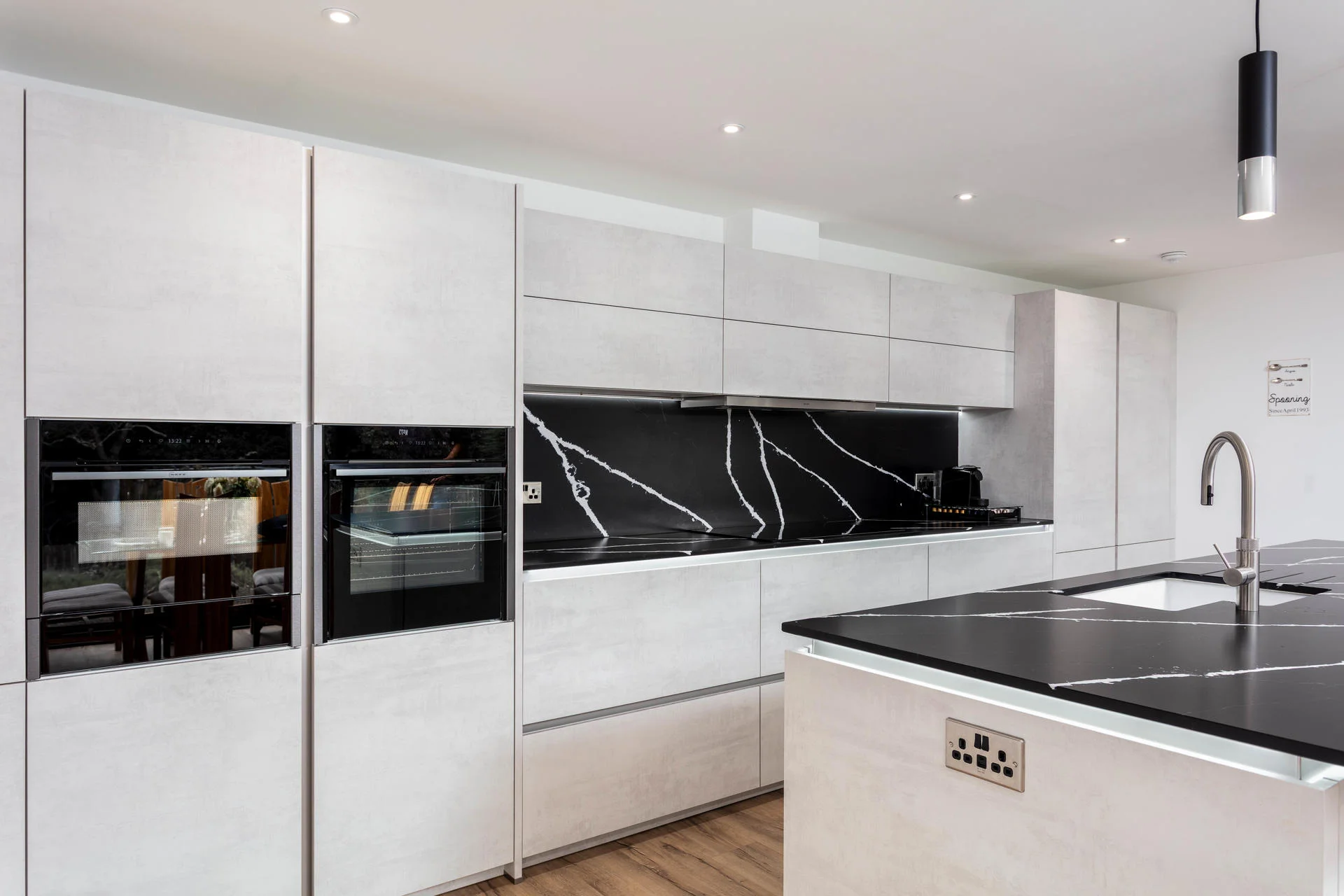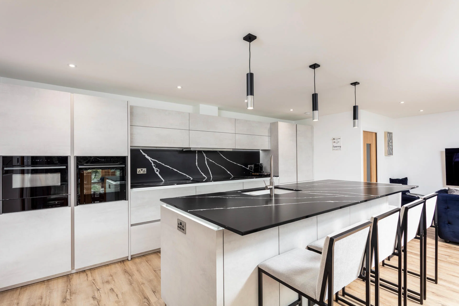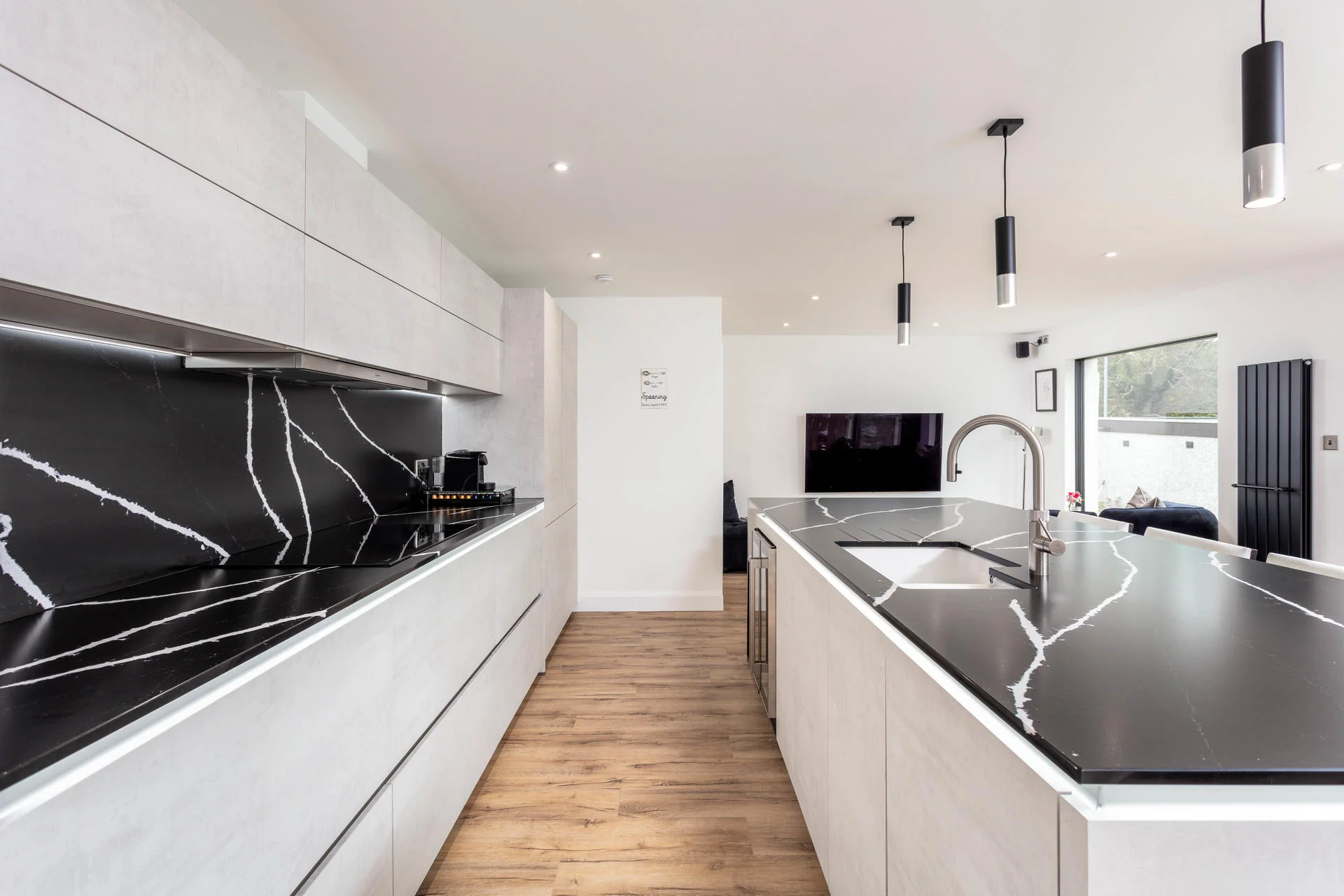To bring this vision to life, Creative Designs supplied and installed a Nolte handleless kitchen with recessed lighting, creating a seamless and refined aesthetic. The design featured Silestone worktops, splashbacks, and waterfall ends to the island in Eternal Marquina, chosen for their luxurious dark tone and striking visual appeal.