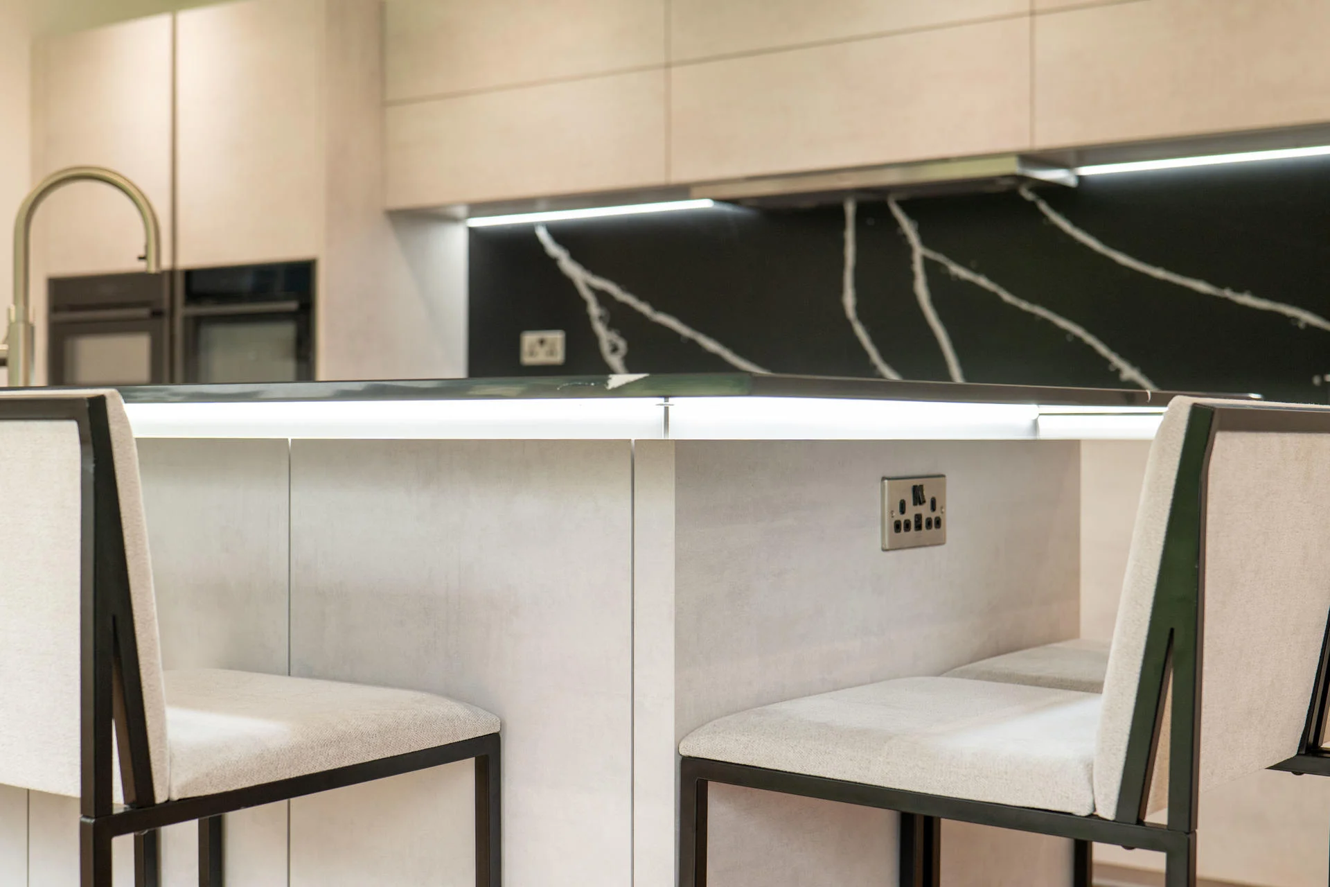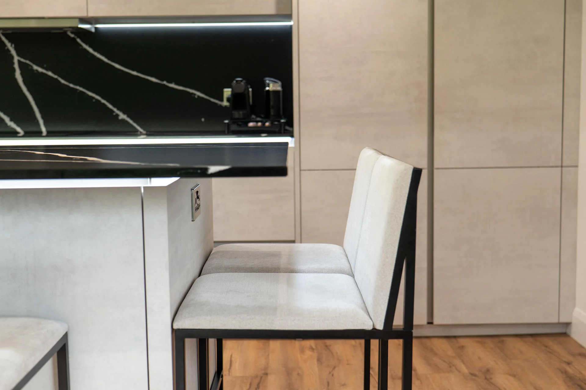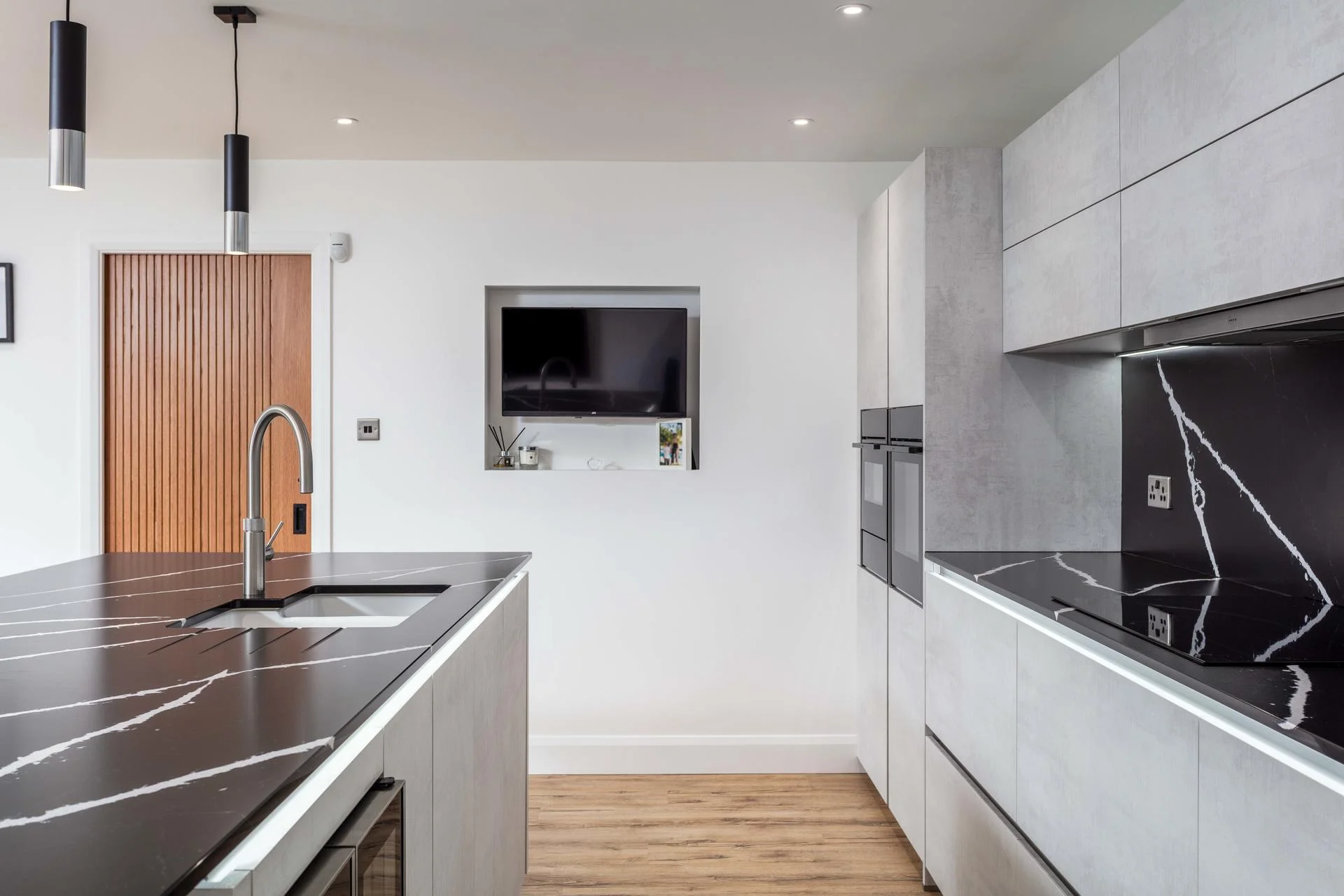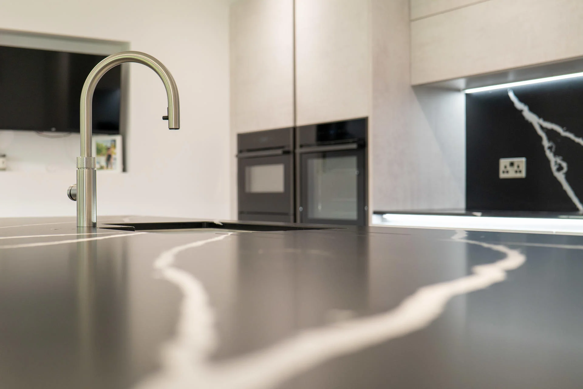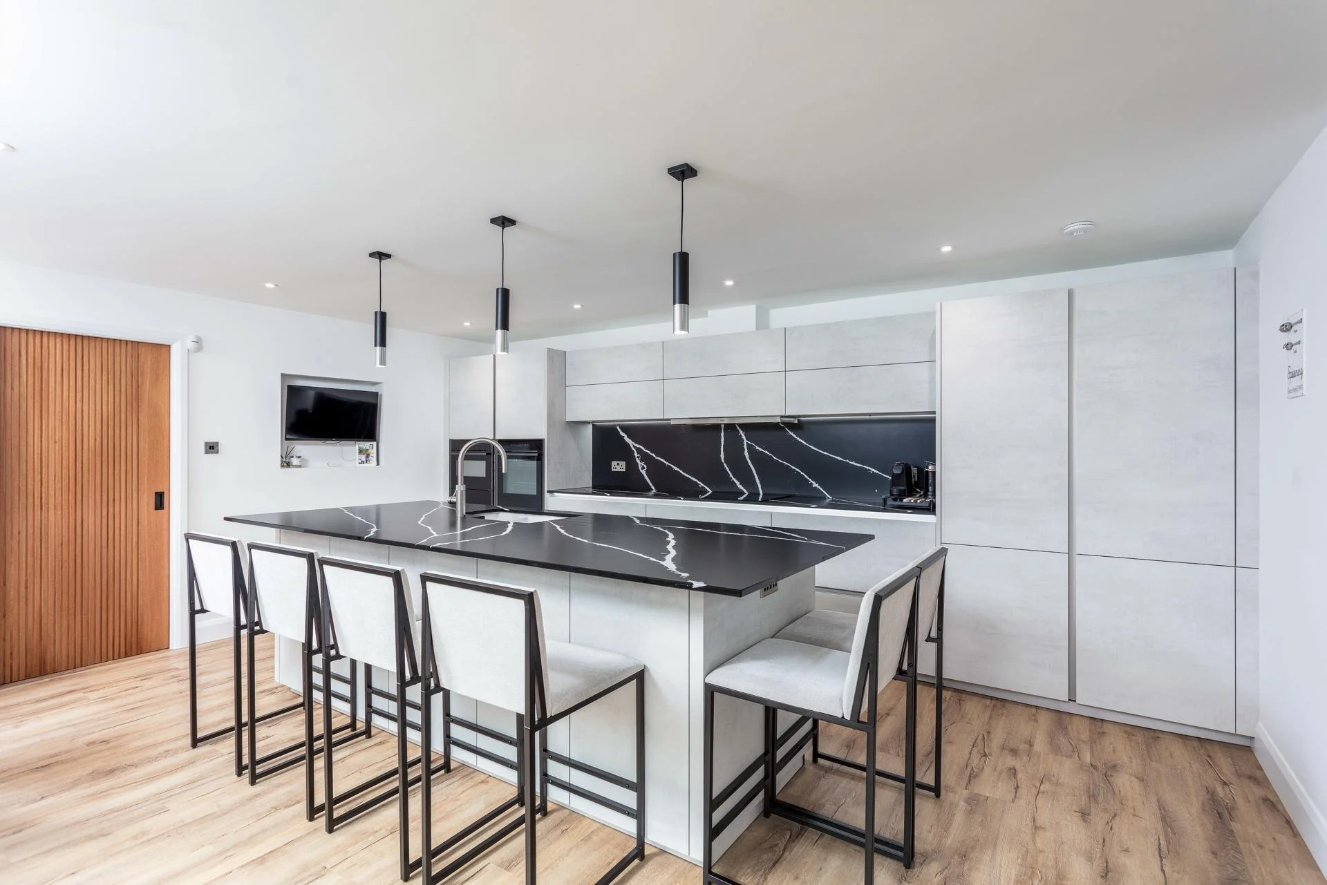 To bring this vision to life, Creative Designs supplied and installed a Nolte handleless kitchen with recessed lighting, creating a seamless and refined aesthetic. The design featured Silestone worktops, splashbacks, and waterfall ends to the island in Eternal Marquina, chosen for their luxurious dark tone and striking visual appeal.