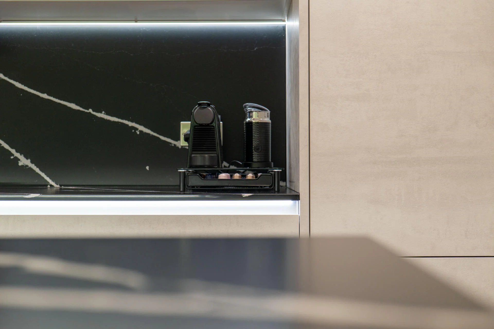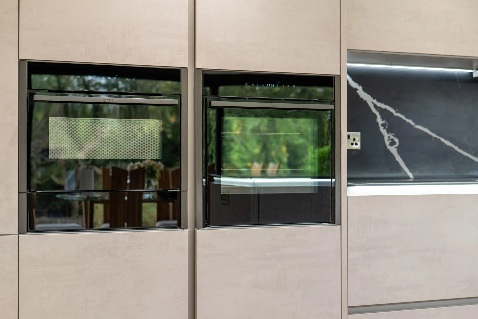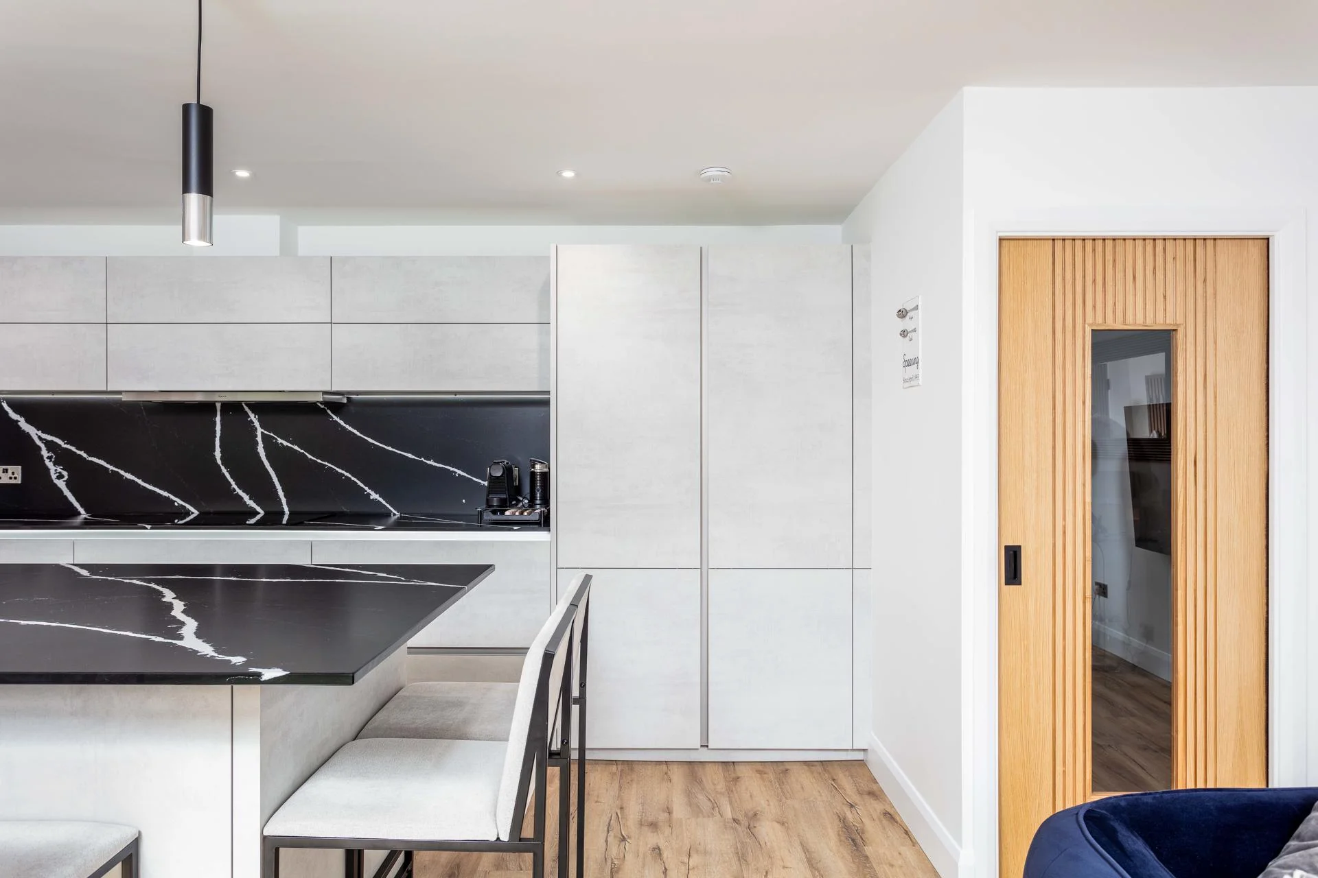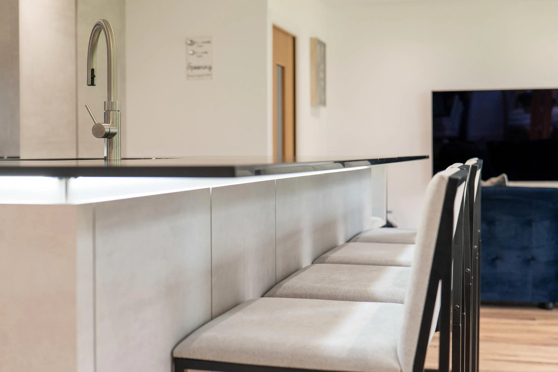To bring this vision to life, Creative Designs supplied and installed a Nolte handleless kitchen with recessed lighting, creating a seamless and refined aesthetic. The design featured Silestone worktops, splashbacks, and waterfall ends to the island in Eternal Marquina, chosen for their luxurious dark tone and striking visual appeal.