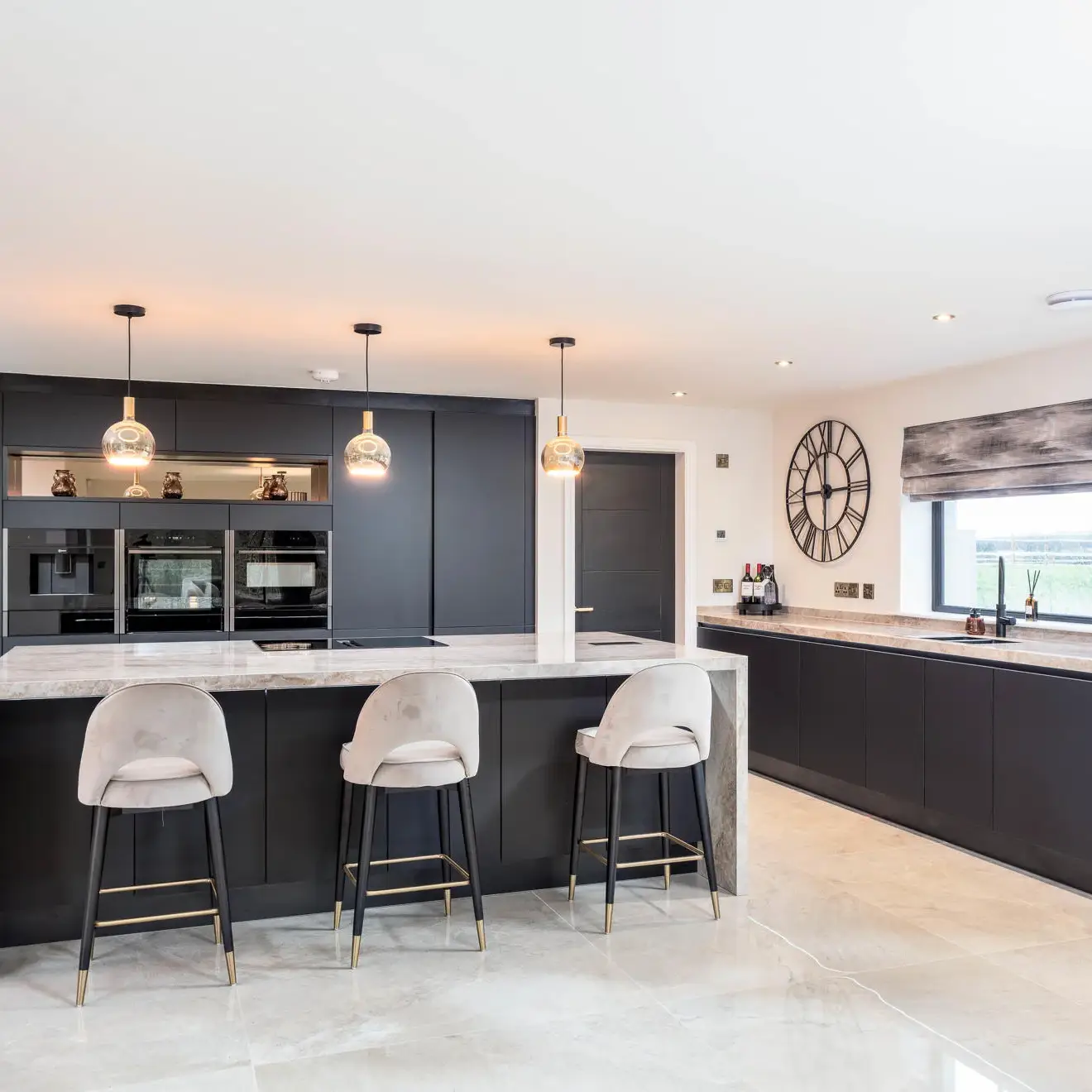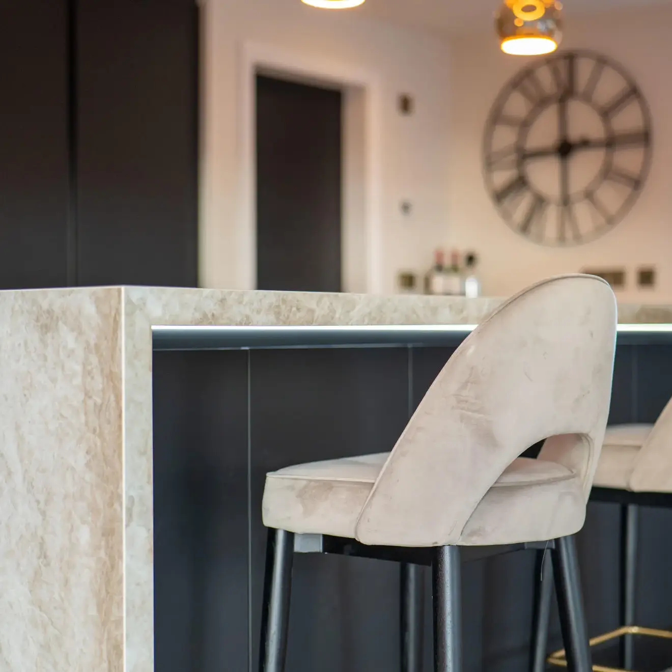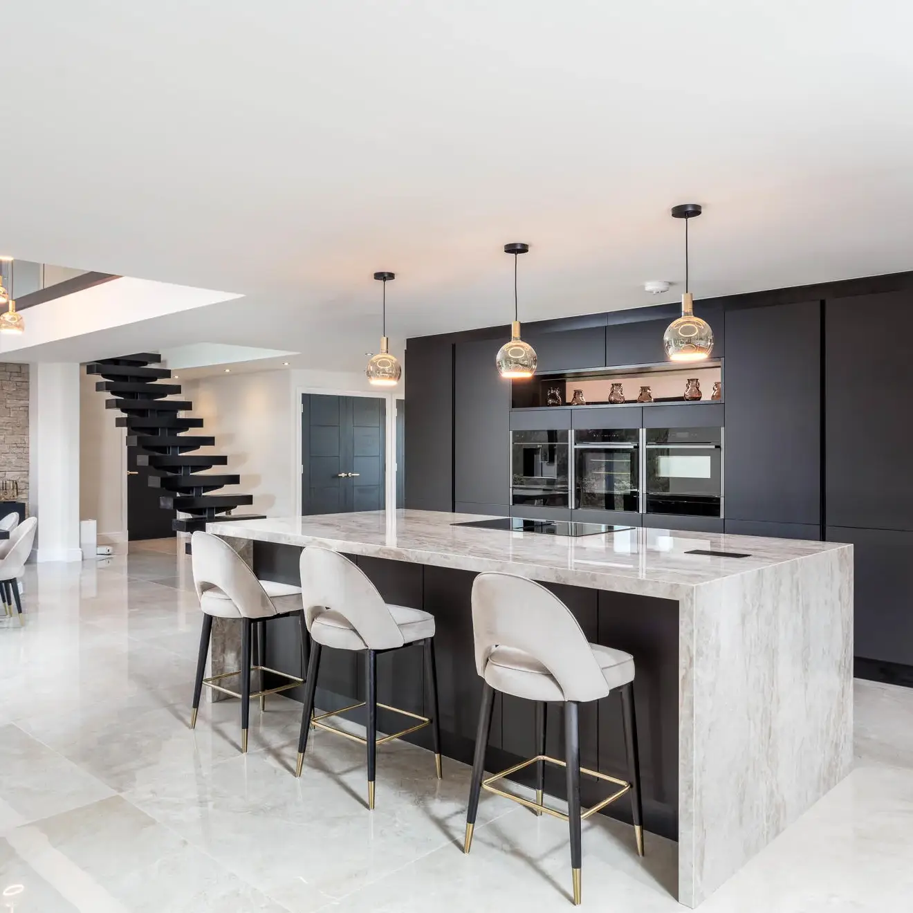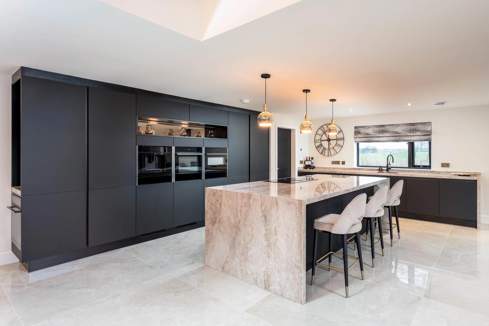 The finished design features a Nolte handleless kitchen, delivering a streamlined and timeless aesthetic. Dekton XGloss worktops with striking waterfall edges were used to create a bold focal point, complemented by mirror splashbacks that enhance light and add a sense of space.
