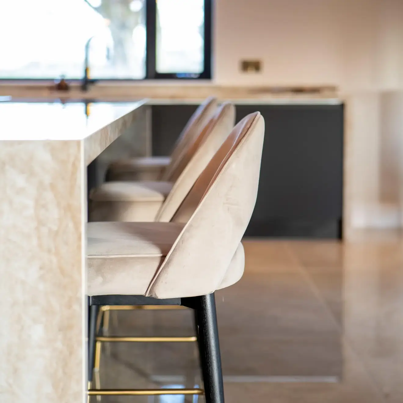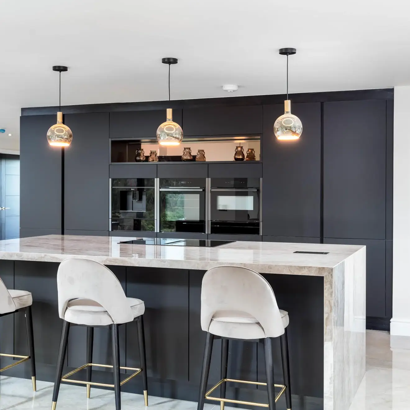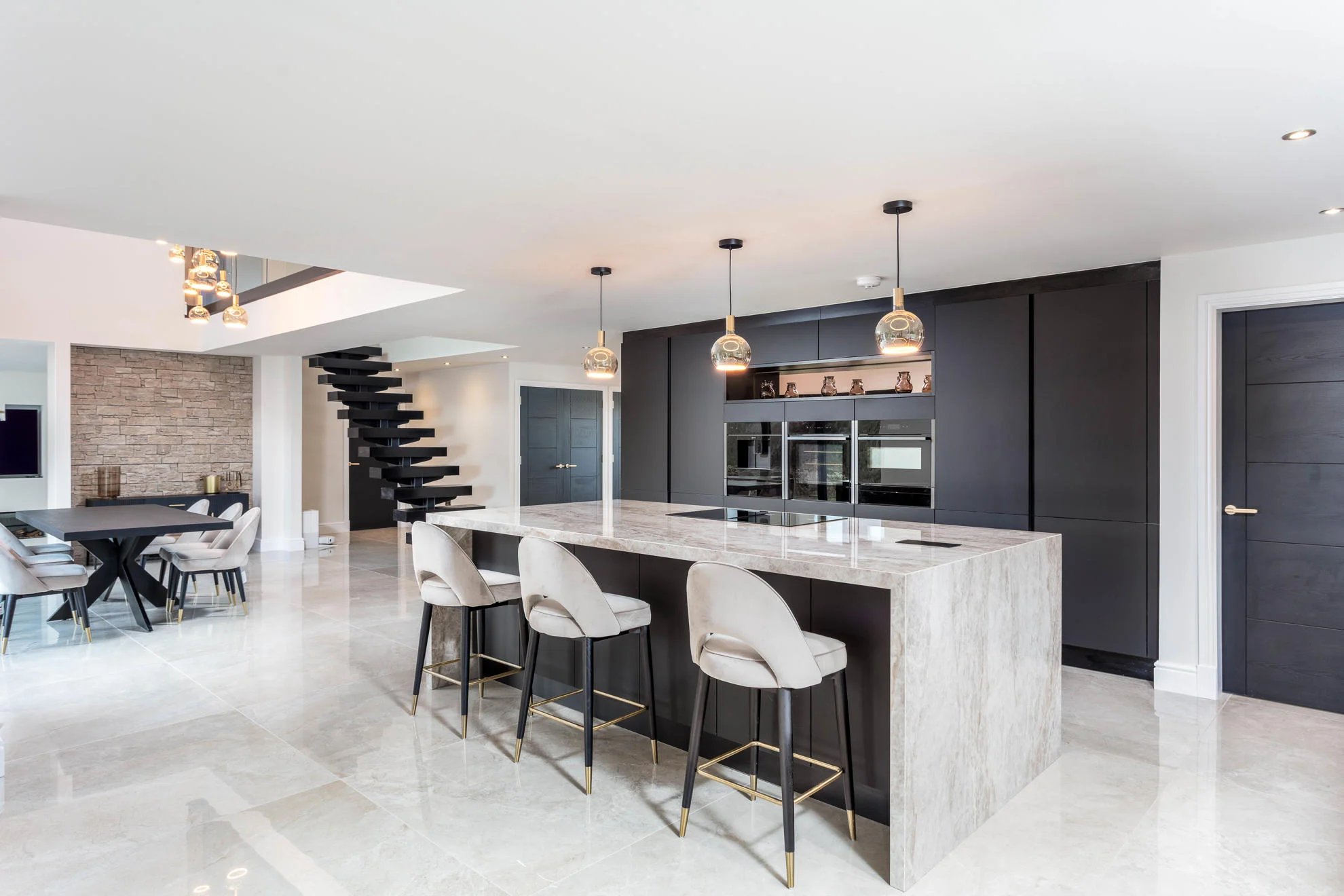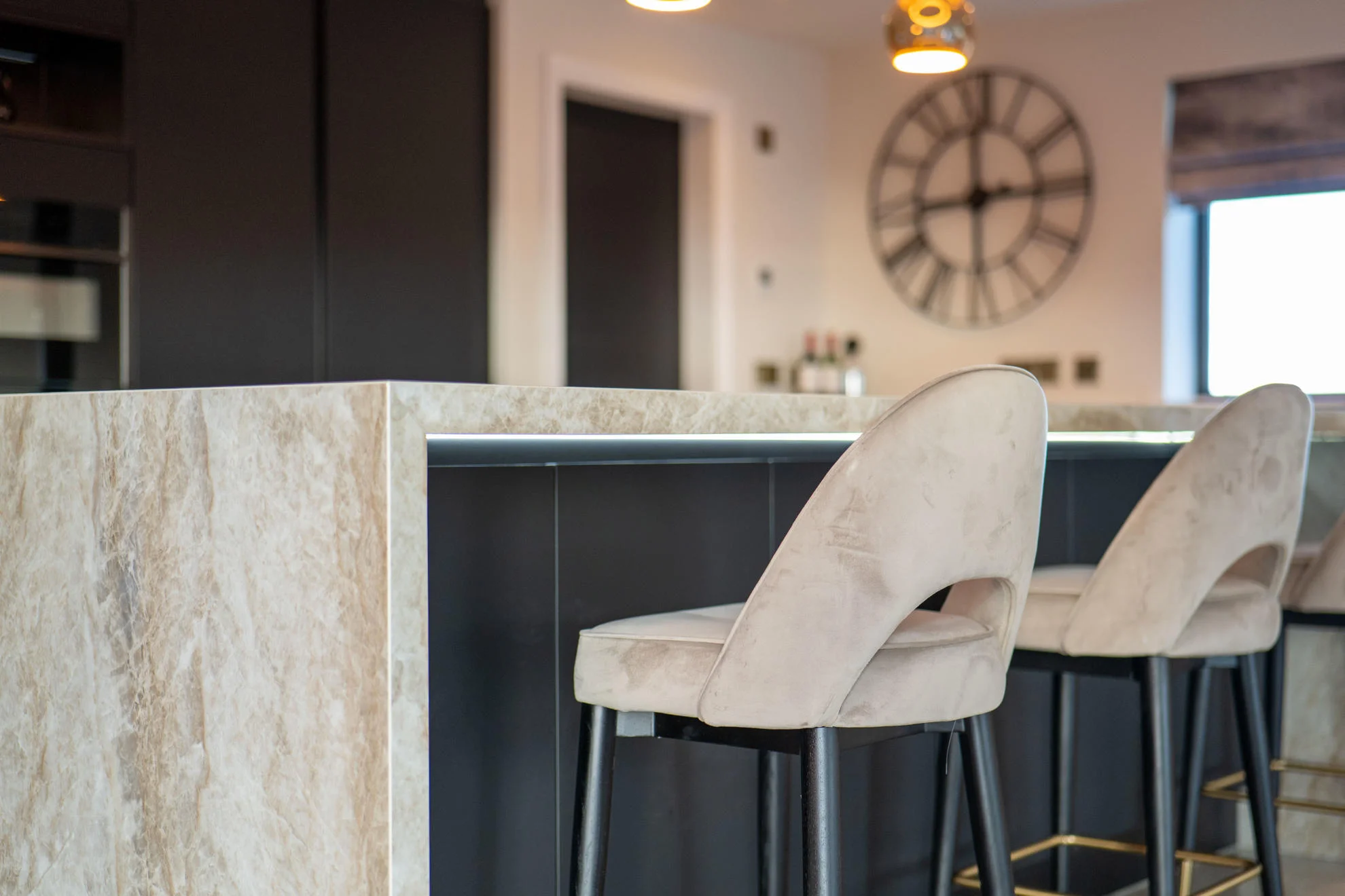 The finished design features a Nolte handleless kitchen, delivering a streamlined and timeless aesthetic. Dekton XGloss worktops with striking waterfall edges were used to create a bold focal point, complemented by mirror splashbacks that enhance light and add a sense of space.
