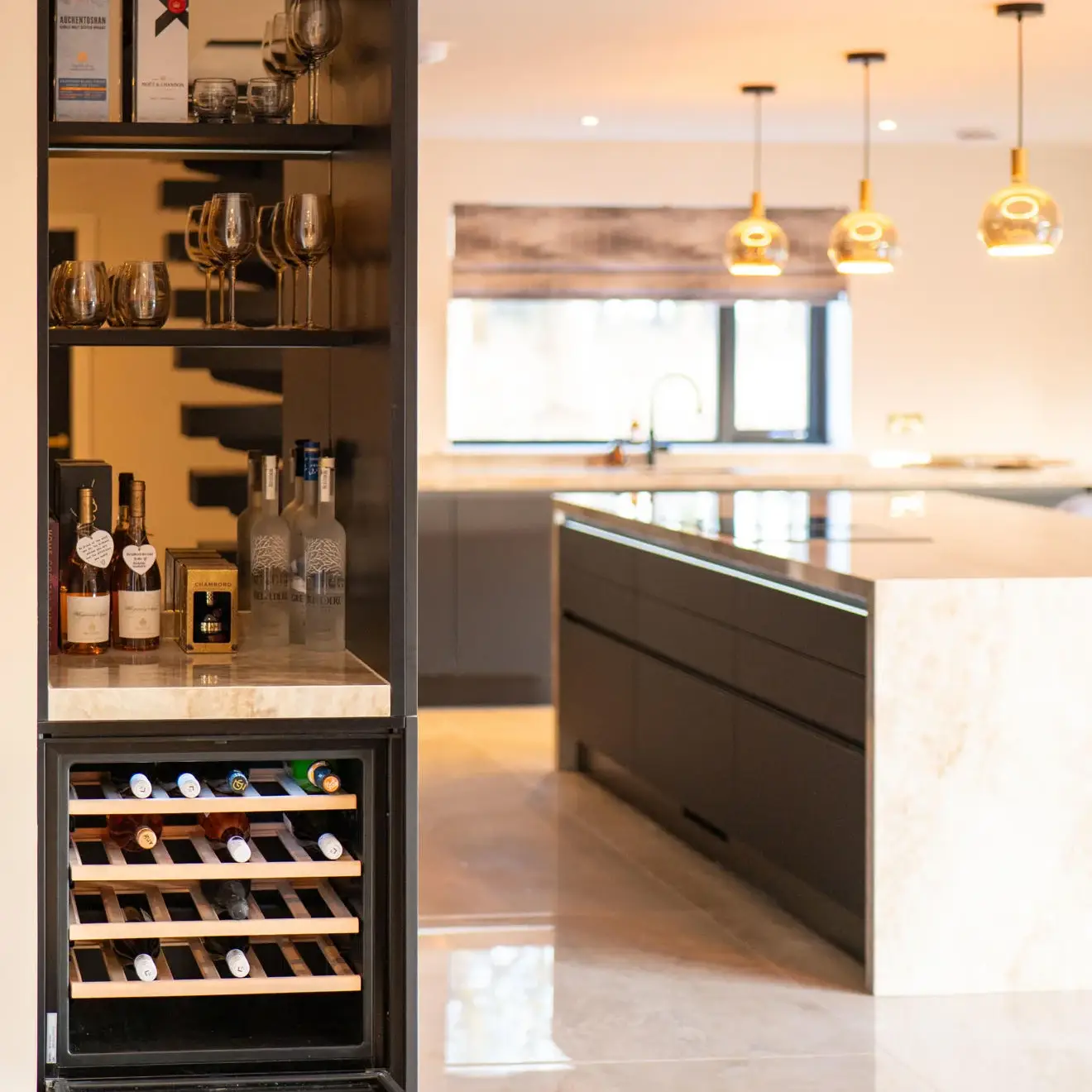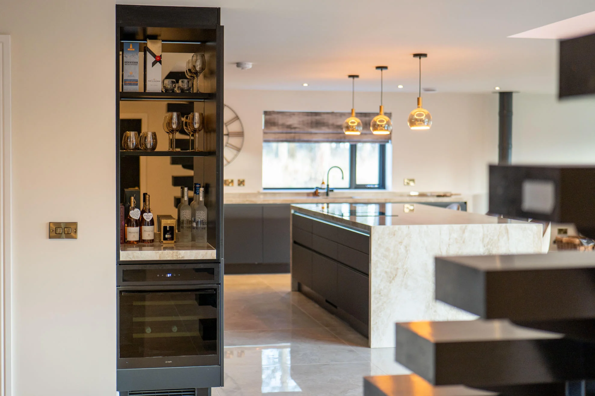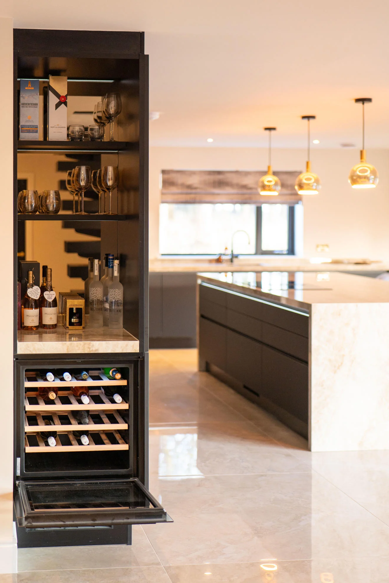 Storage was maximised with a full-height fridge and an adjacent tall unit with interior pull-outs, while an open shelf above the tall units adds a softer, decorative element. The kitchen also incorporates a dedicated drinks area complete with a wine cooler, perfect for entertaining. A modern venting hob was installed within the island, providing a space-saving solution while eliminating the need for overhead extraction and helping to maintain clear sightlines across the room.