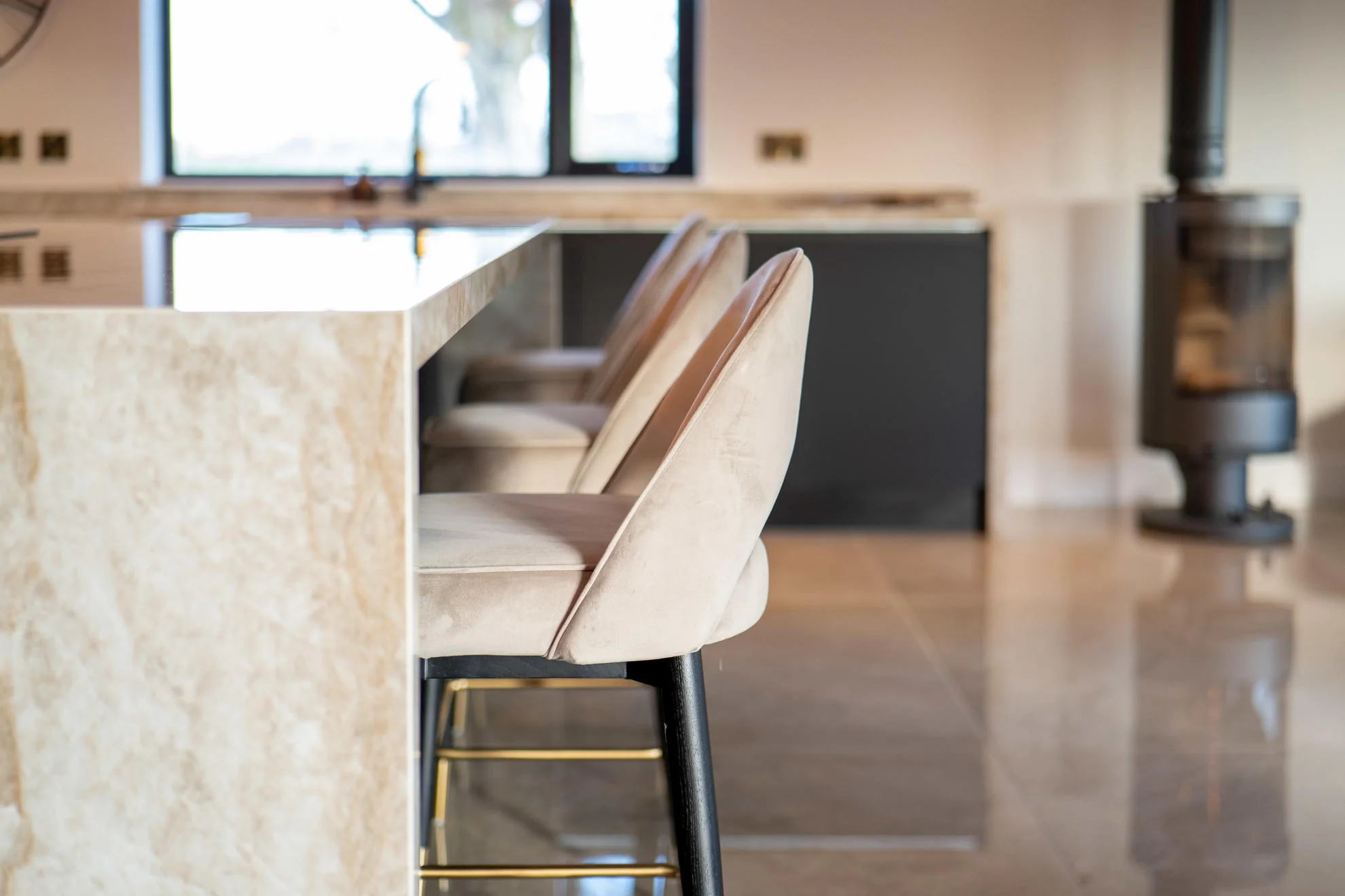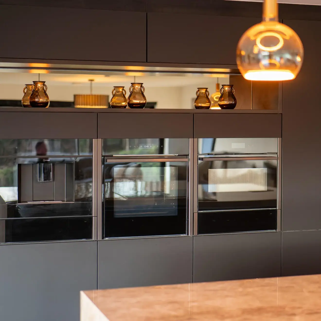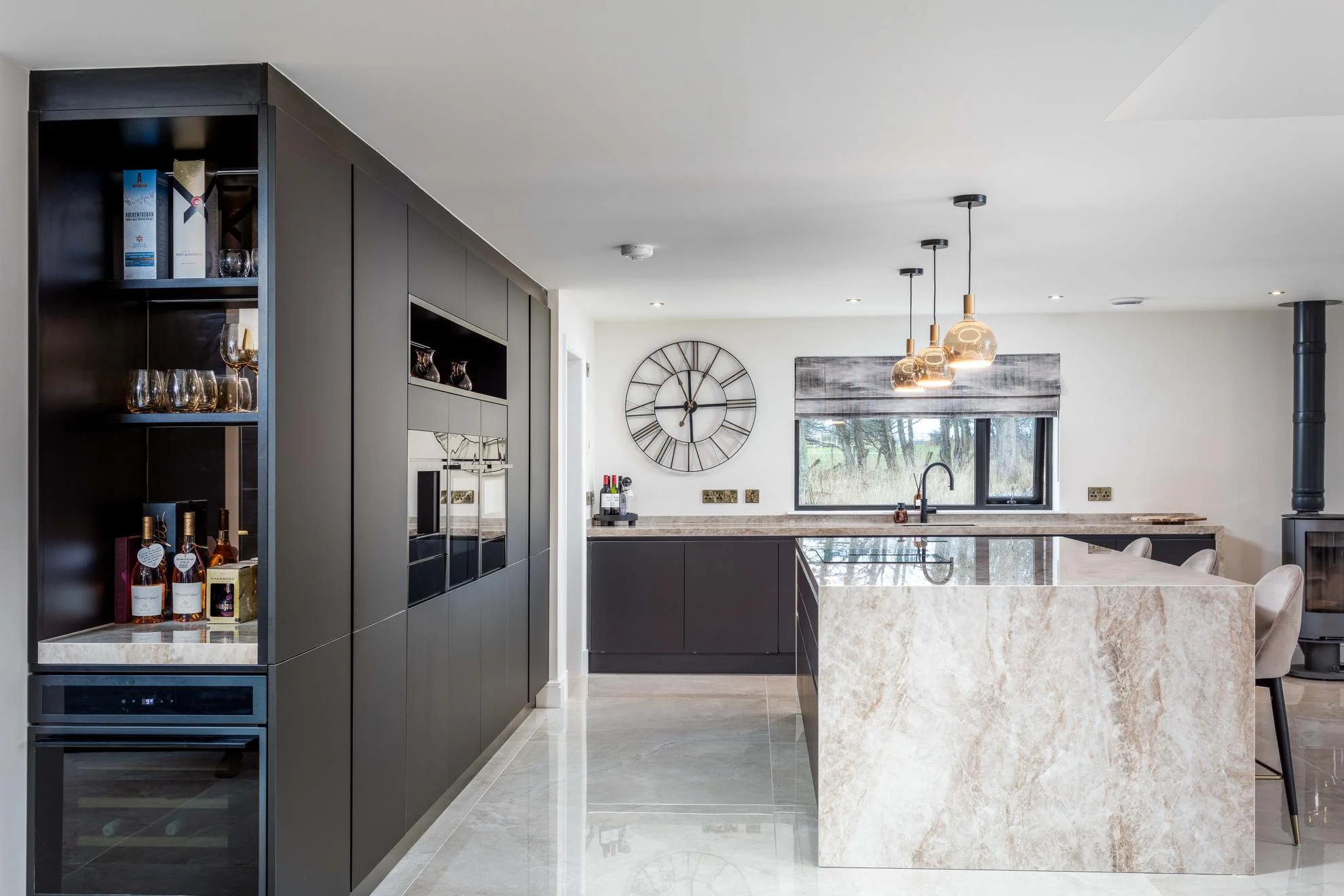 Storage was maximised with a full-height fridge and an adjacent tall unit with interior pull-outs, while an open shelf above the tall units adds a softer, decorative element. The kitchen also incorporates a dedicated drinks area complete with a wine cooler, perfect for entertaining. A modern venting hob was installed within the island, providing a space-saving solution while eliminating the need for overhead extraction and helping to maintain clear sightlines across the room.