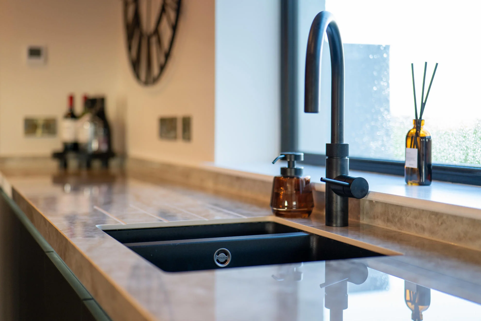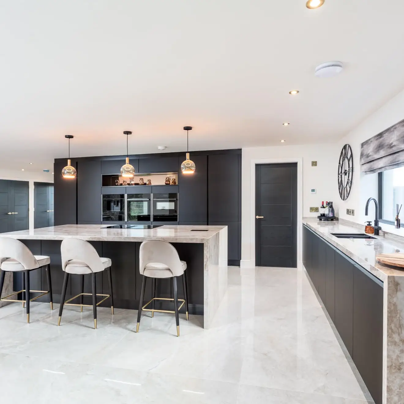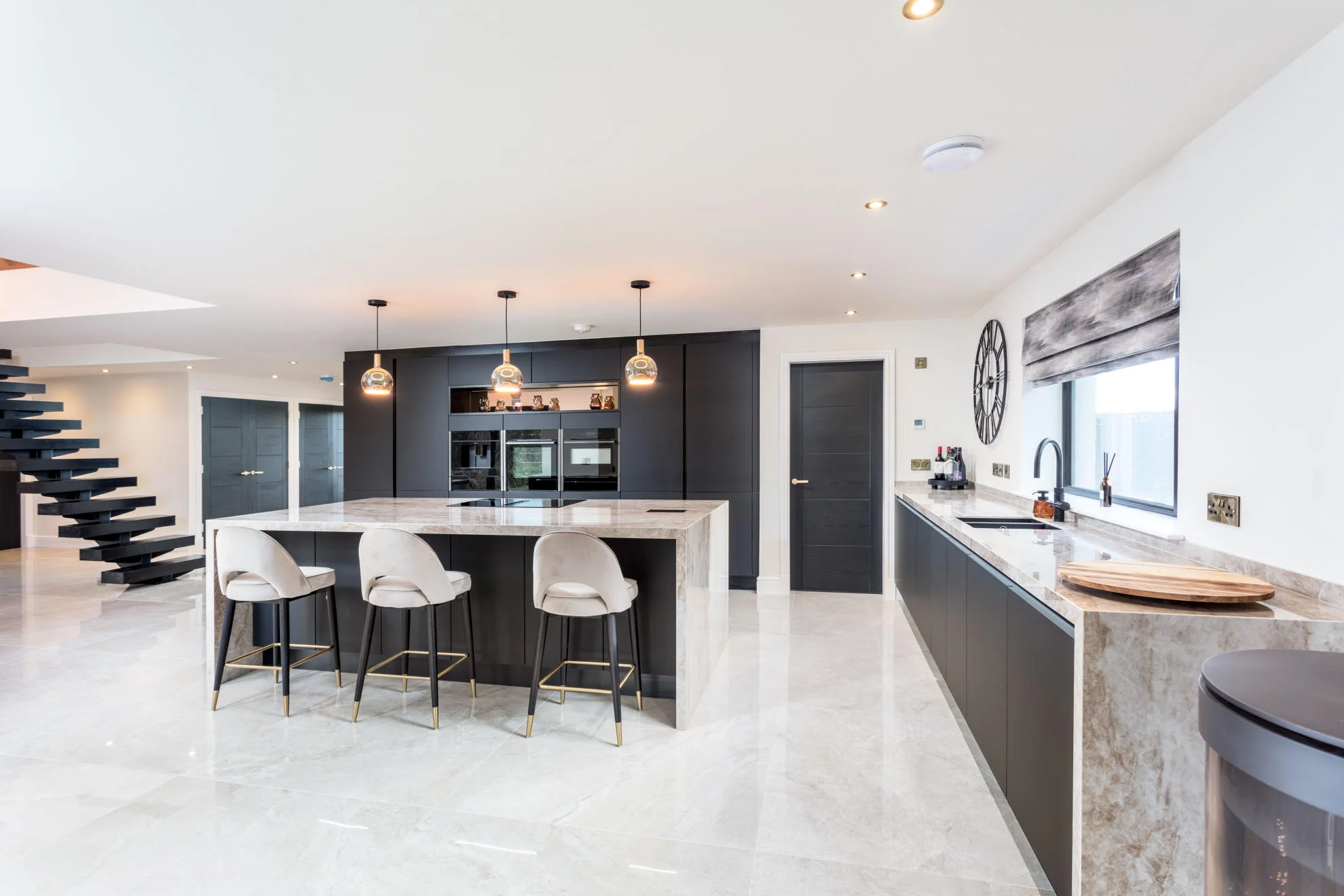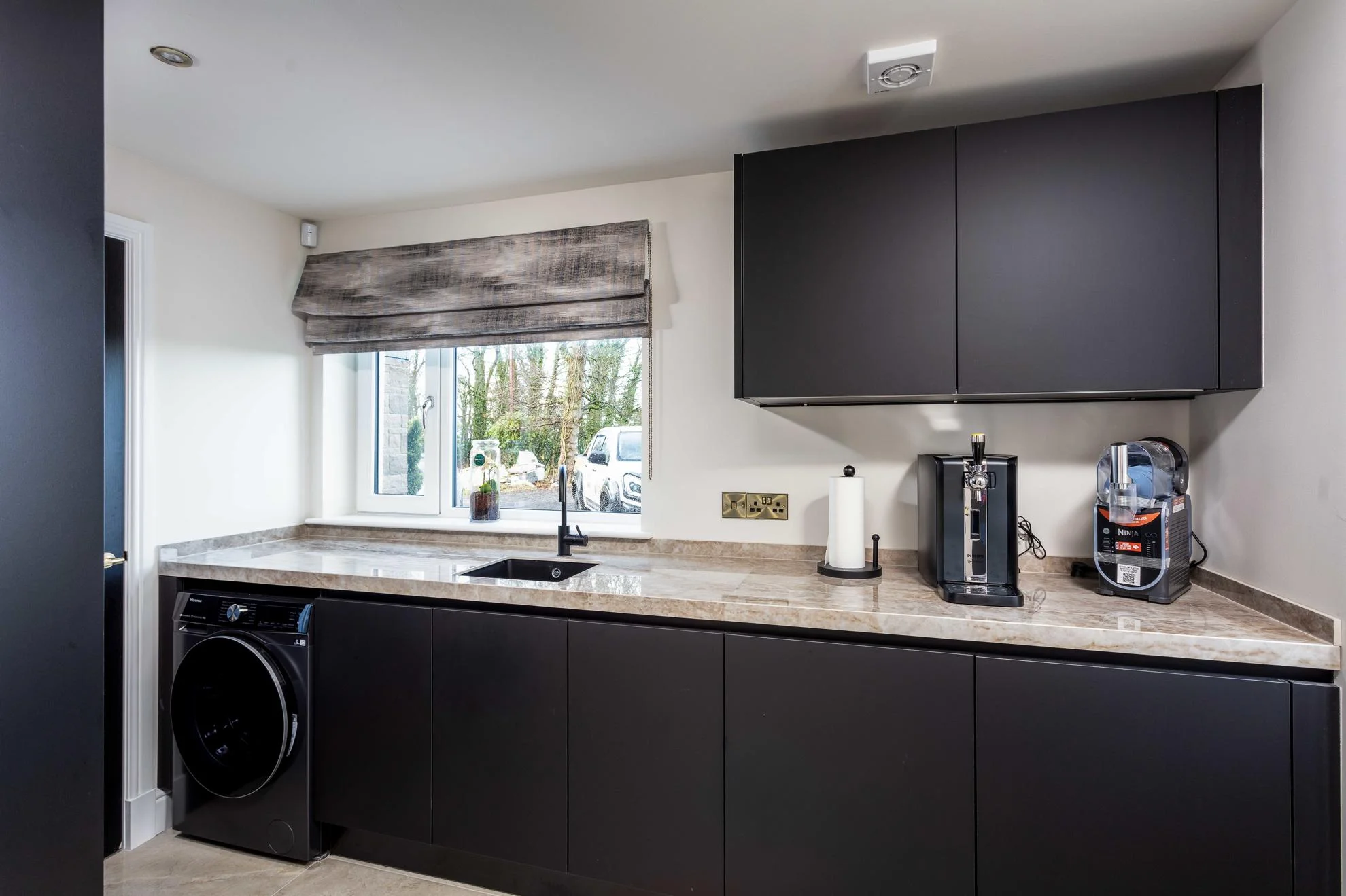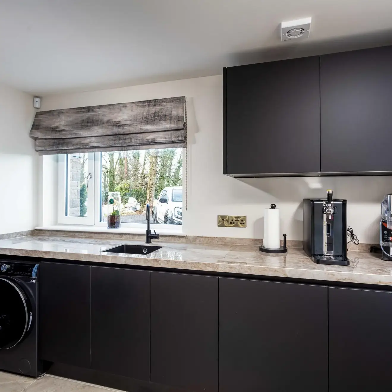 The look was completed with a coordinated black Quooker tap, black sink, and black worktop socket, while a broom cupboard in the utility was also incorporated, providing practical additional storage beyond the main kitchen area.